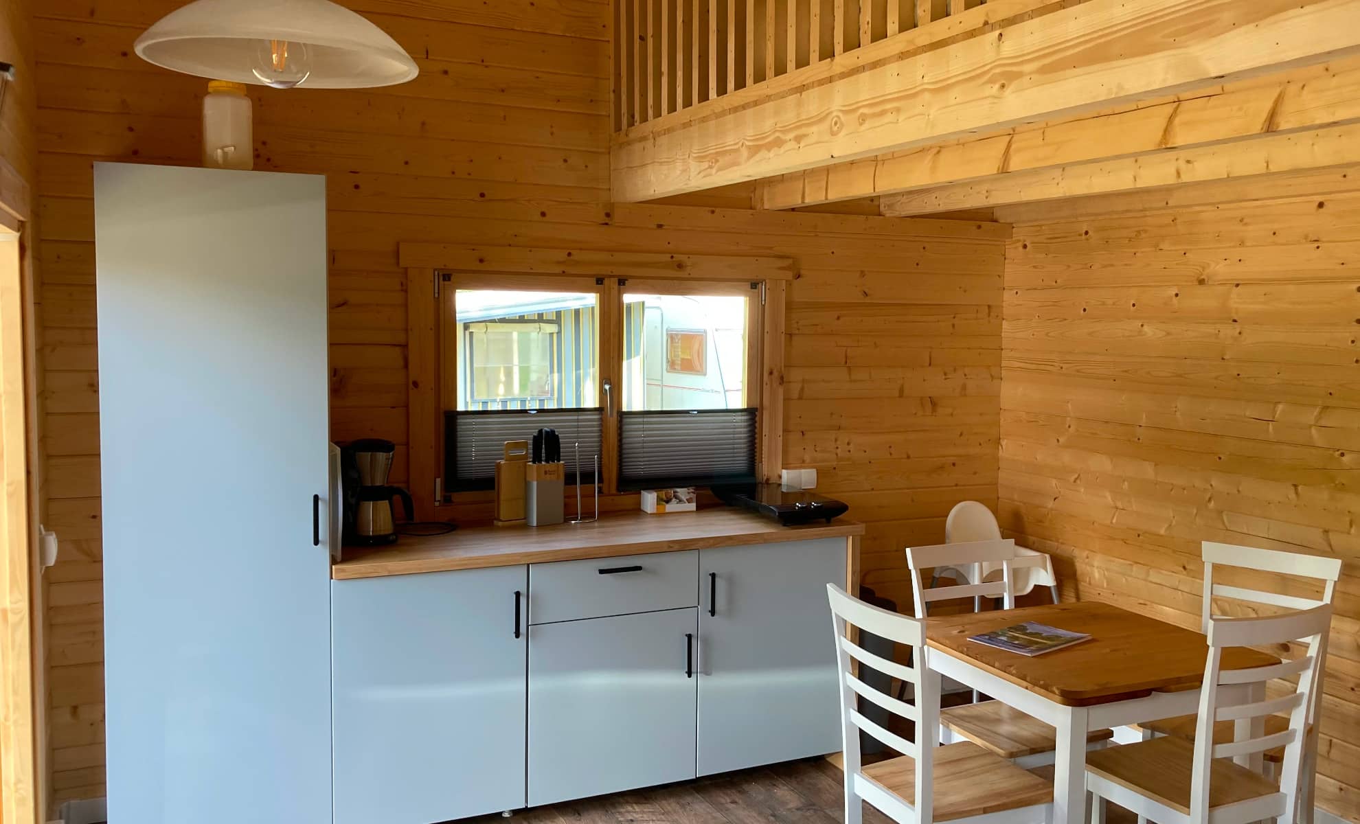 Die Hütte verfügt über eine komplett ausgestattete Küche und bietet alle Möglichkeiten, um zusammen leckere Speisen zuzubereiten. Der Essbereich bietet Platz für vier Personen.