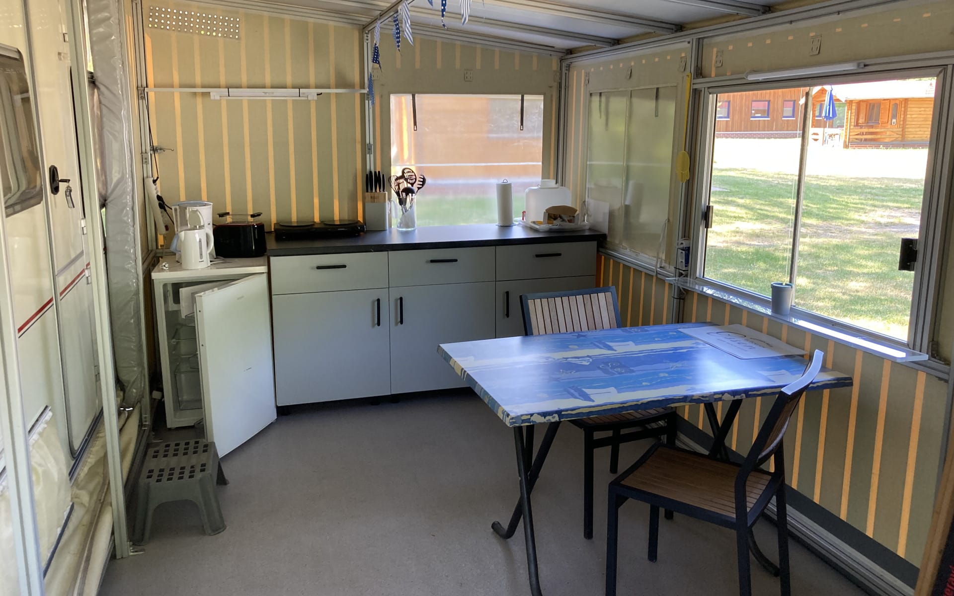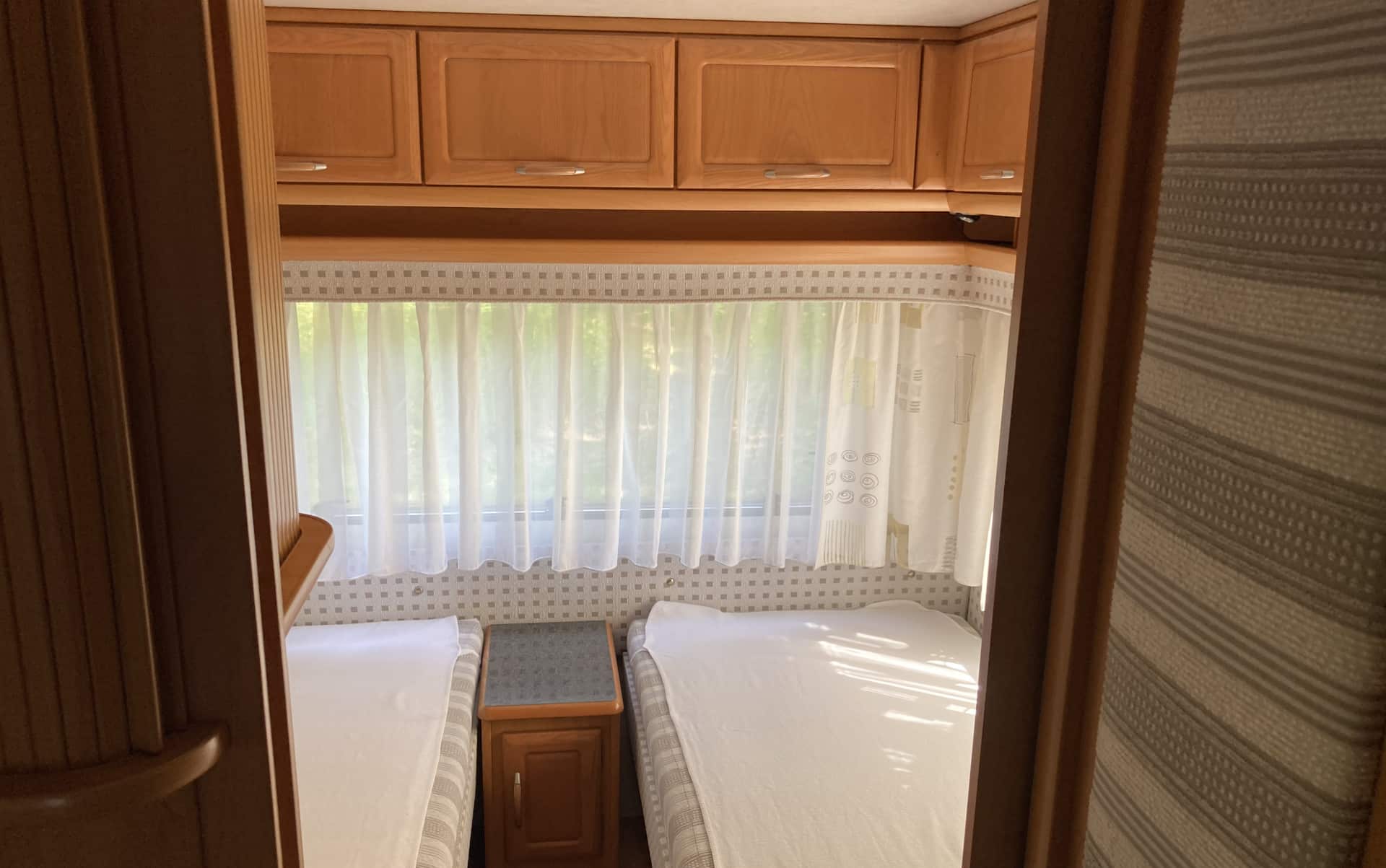 Der gemütliche Wohnwagen ist sehr gut für zwei Erwachsene und ein Kind geeignet. Gemütliche Einzelbetten laden zum Schlafen ein und sind natürlich mit Leselicht ausgestattet. Selbstverständlich verfügt der Wohnwagen über eine Vollausstattung inkl. Geschirr, Stromanschluss und Gas.